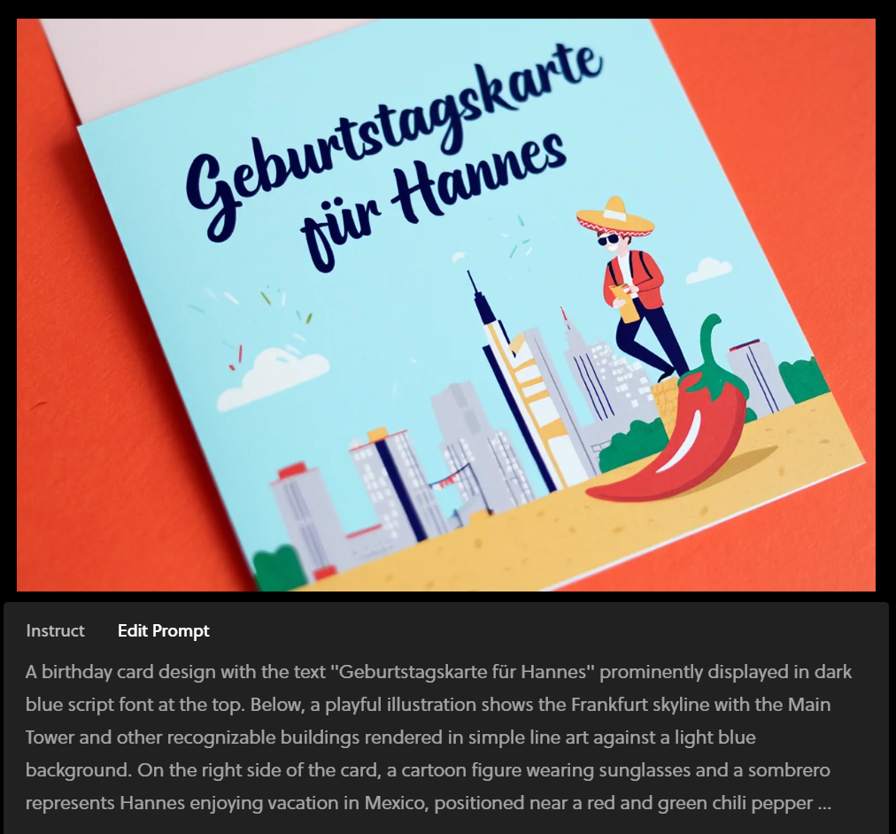 Prompt: „Geburtstagkarte für Hannes, mittlerweile in Frankfurt lebend und aktuell auf einem Trip in Mexico“