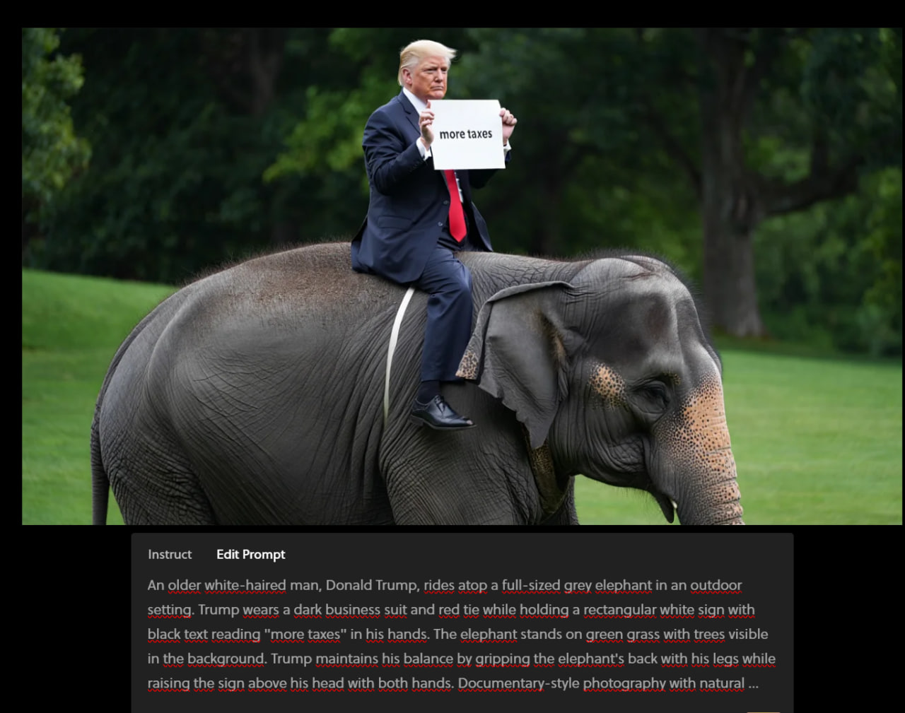 Prompt: „Picture of Trump riding an elephant with a shield saying 'more taxes'“