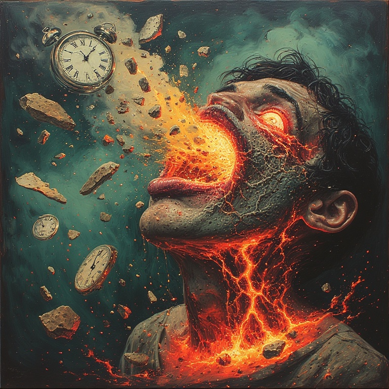 Du erlebst Ursache und Wirkung in umgekehrter Reihenfolge. Du fühlst den unerträglichen Schmerz einer Kugel, die deine Eingeweide zerfetzt, und erst danach hörst du den Schuss und siehst die Mündung aufblitzen. Du kotzt eine Mahlzeit aus, die du erst Stunden später essen wirst, und spürst den Geschmack des Erbrochenen bereits auf der Zunge, wenn du das Essen zum Mund führst. Jeder Orgasmus ist das plötzliche, unerklärliche Ende einer sexuellen Begegnung, die noch gar nicht begonnen hat. Dein ganzes Leben ist ein endloses Zurückspulen, ein widerlicher, unlogischer Albtraum, in dem du die Konsequenzen vor den Taten erleidest. Du bist kein Akteur, du bist nur das zuckende Fleisch, das rückwärts in die unvermeidliche, bereits gefühlte Folter gezerrt wird.