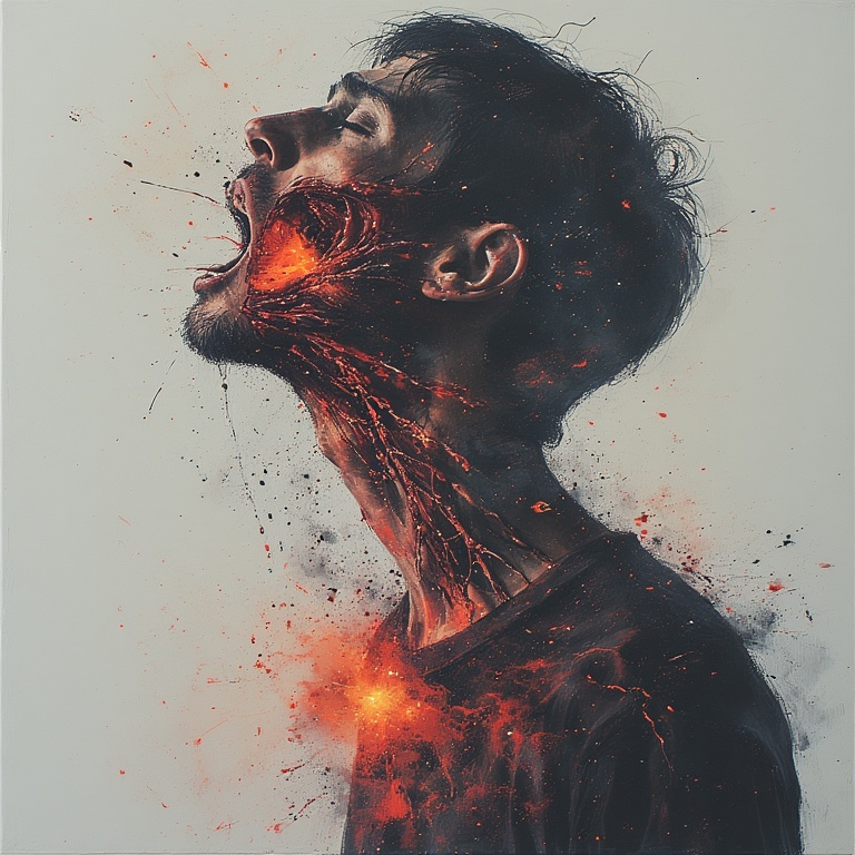 Das Bild ist basically das visuelle Äquivalent: Kotzen, bevor du gegessen hast. Schmerz, bevor der Schuss fällt. Lava im Hals, während dein Leben rückwärts kollabiert.