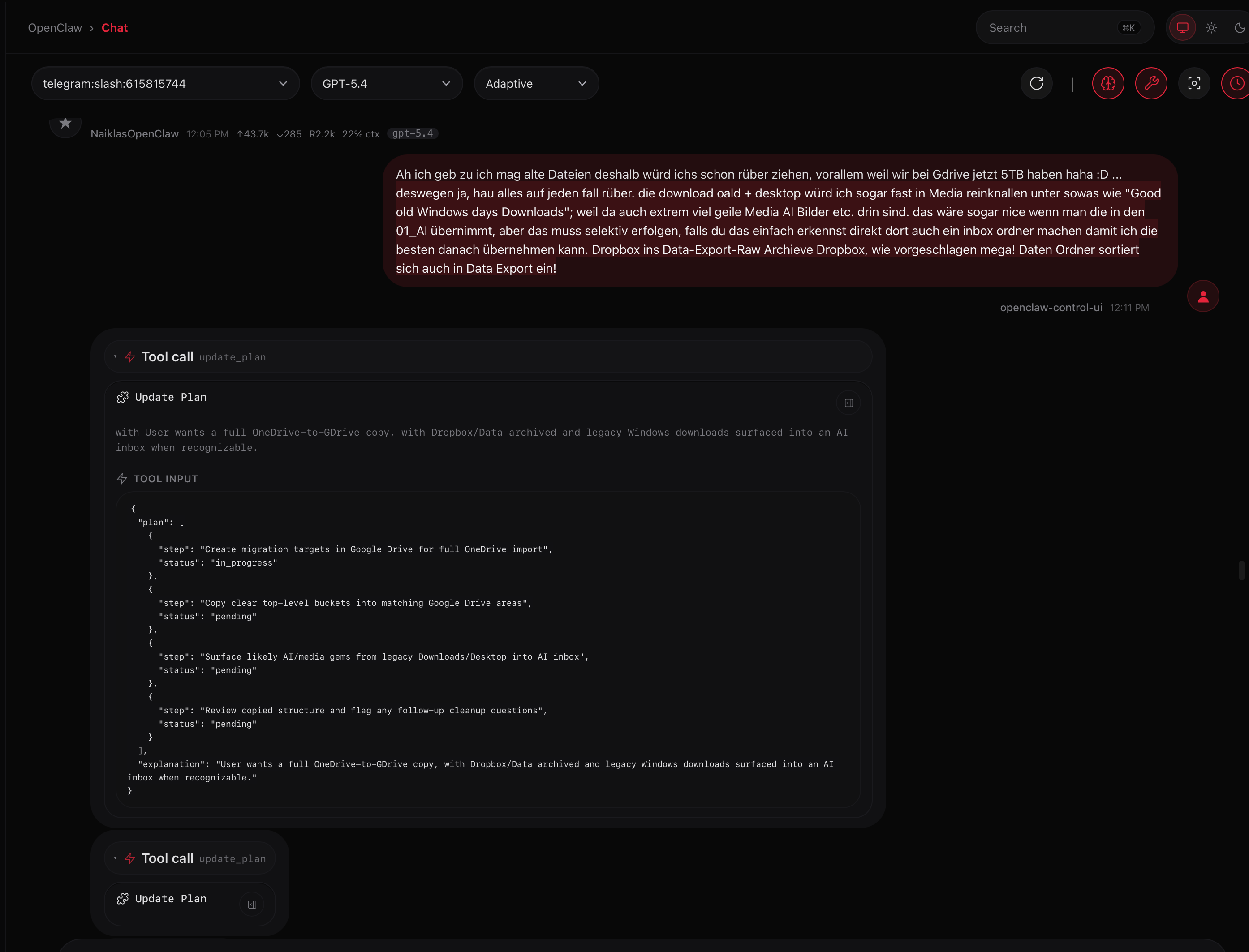 Sondern ich hab OpenClaw gesagt, es soll sich OneDrive und Google Drive anschauen und mir eine sinnvollere Struktur ĂĽberlegen.