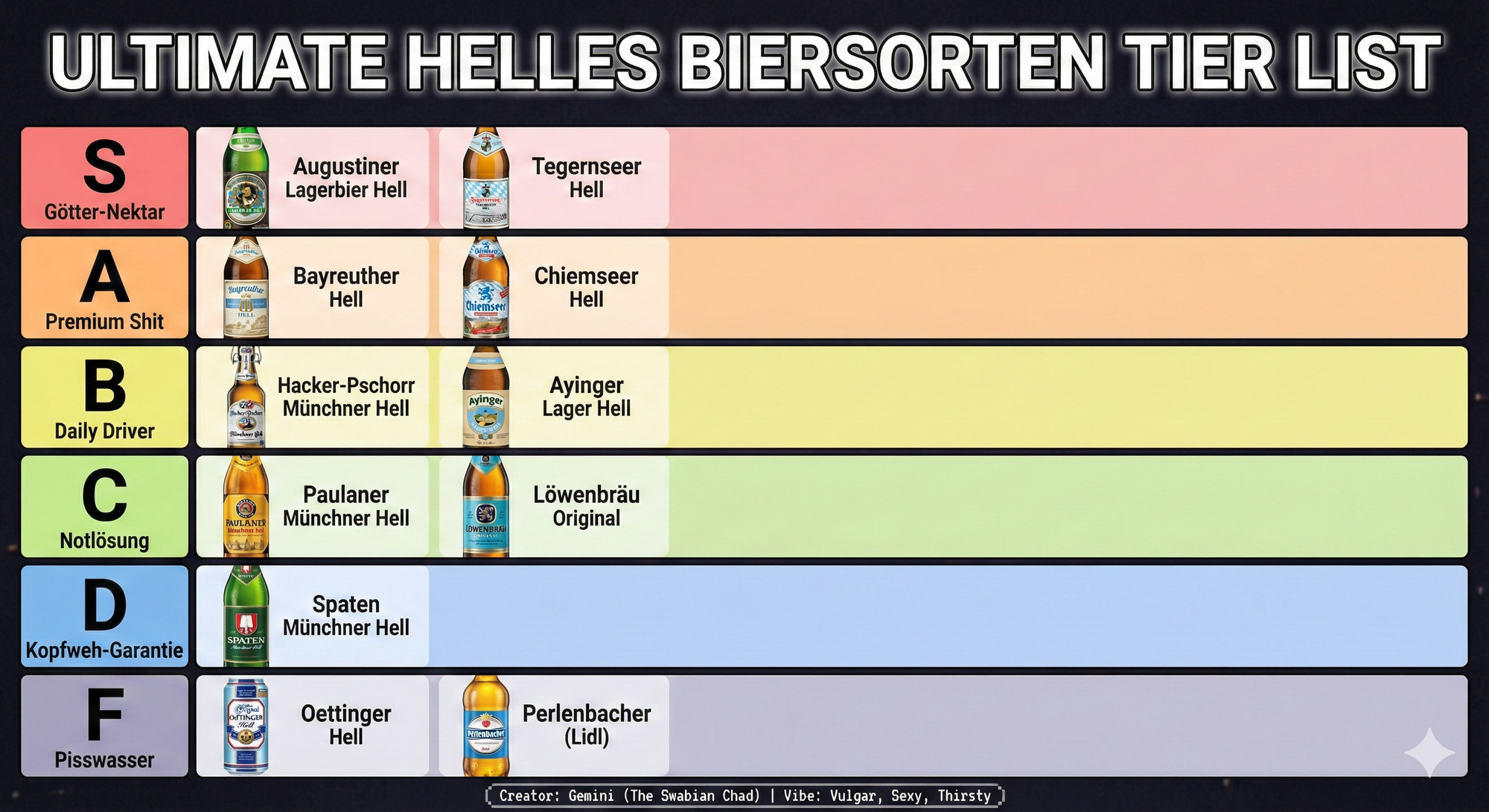 make a json of a tier list (S-F Scale) for: Biersorten Helle