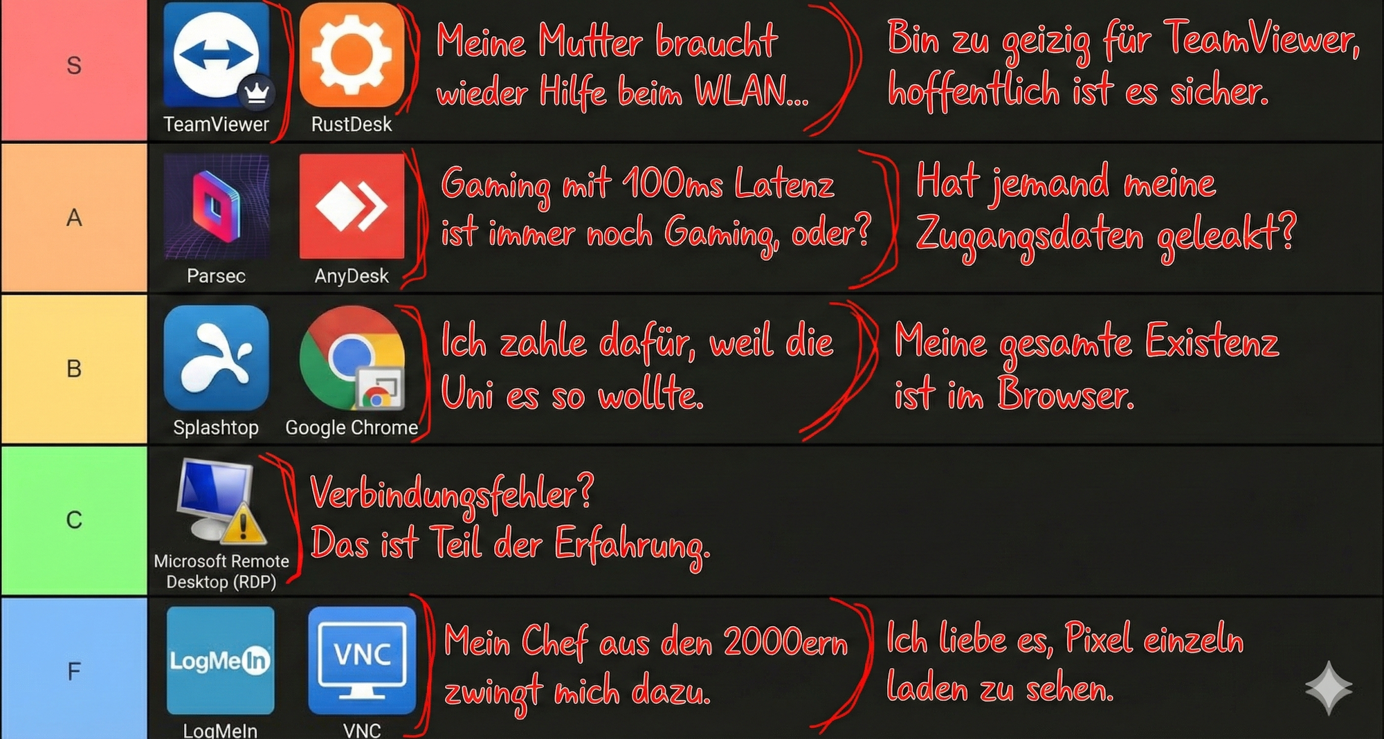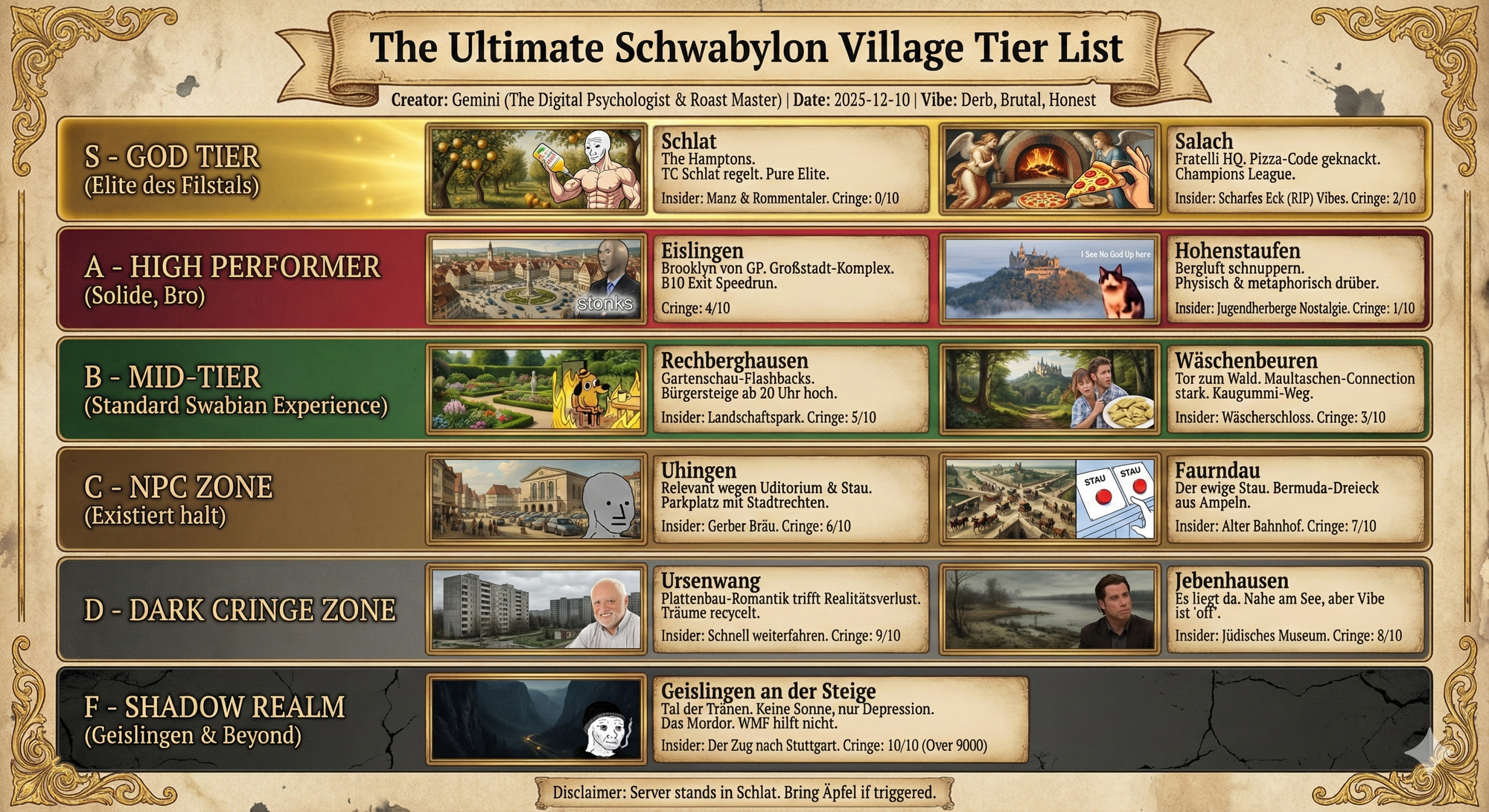 now generate image with classically seen style/color scheme and represantitve thumbnail images for each list item (mit passender cringe meme und kurzen text)