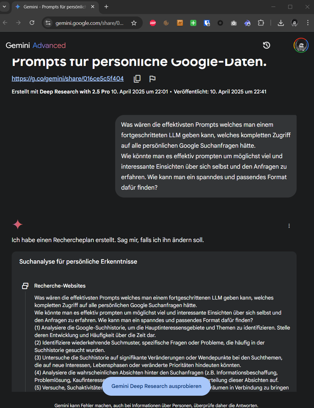 - Prompt-Balance: Man kann’s übertreiben (DeepDive-Level) oder simpel halten – aber dein Google-Verlauf als Kontext ist der wahre Cheatcode.