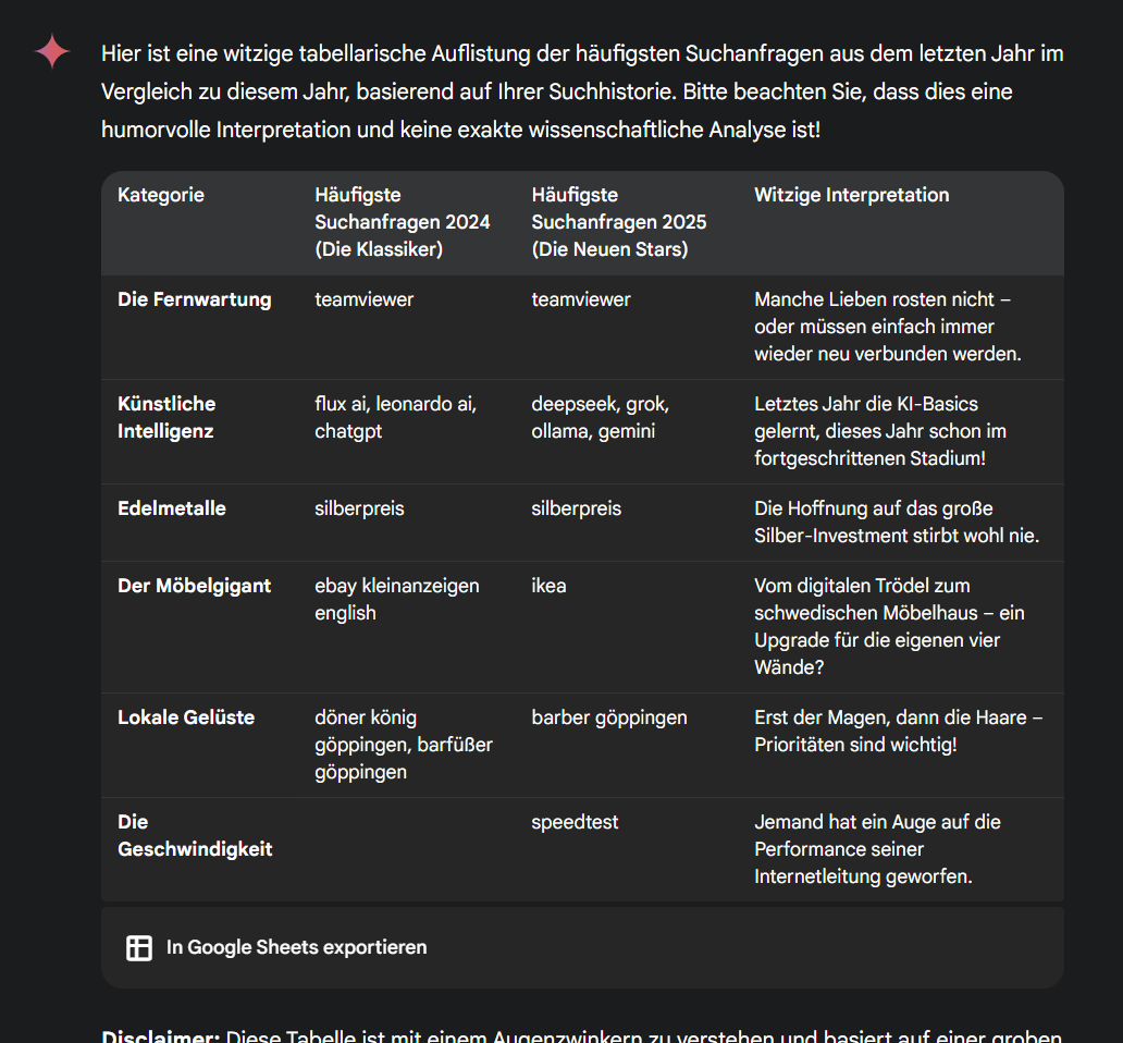 Prompt: "Was waren die häufigsten Suchanfagen letztes Jahr im Vergleich zu diesem Jahr, liste tabellarisch witzig auf!"